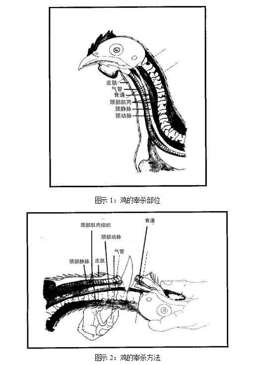n)宰杀时应切断气管、食道、颈动脉和颈静脉,来加速出血及动物的死亡(见1-4图表)。出血应是自然完整的;